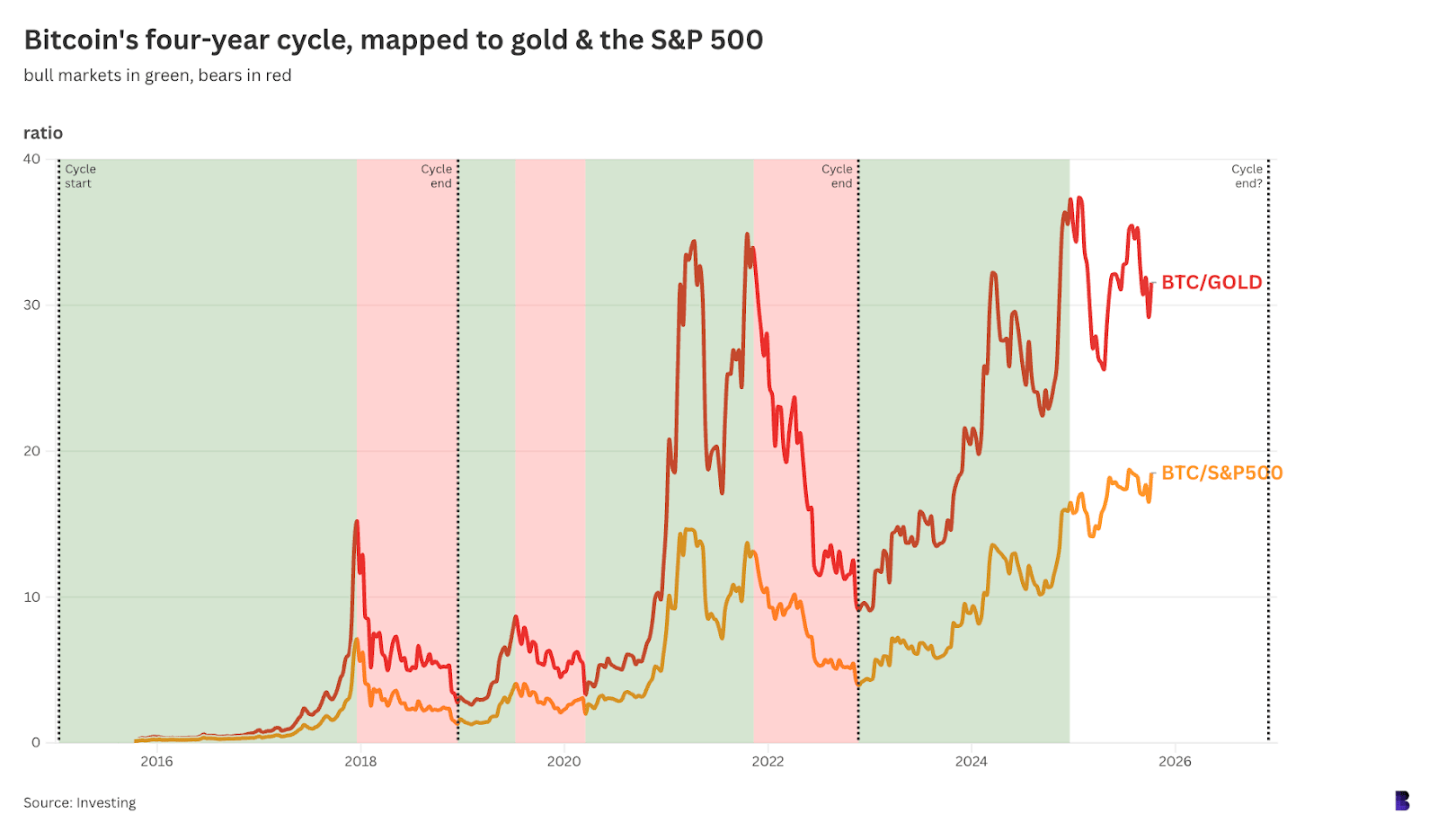 In fact, if we price bitcoin in gold rather than the US dollar, as is shown on the chart above, the current cycle is exactly standard. A new all-time high was set against gold after the halving (at the end of 2024) and not before.