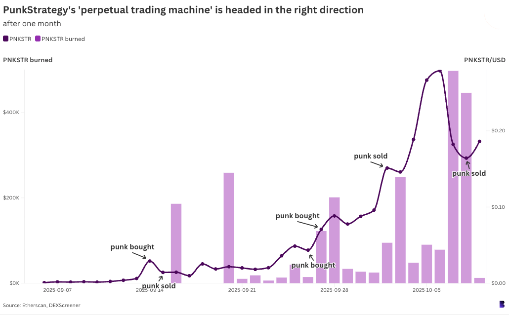 And at least for PNKSTR, the machine is indeed working as intended: The coin is up more than 1,200% since the day before it bought its first CryptoPunk, and it has so far burned 4.2% of its total supply. If burned today, that would be the equivalent of almost $2.5 million PNKSTR.